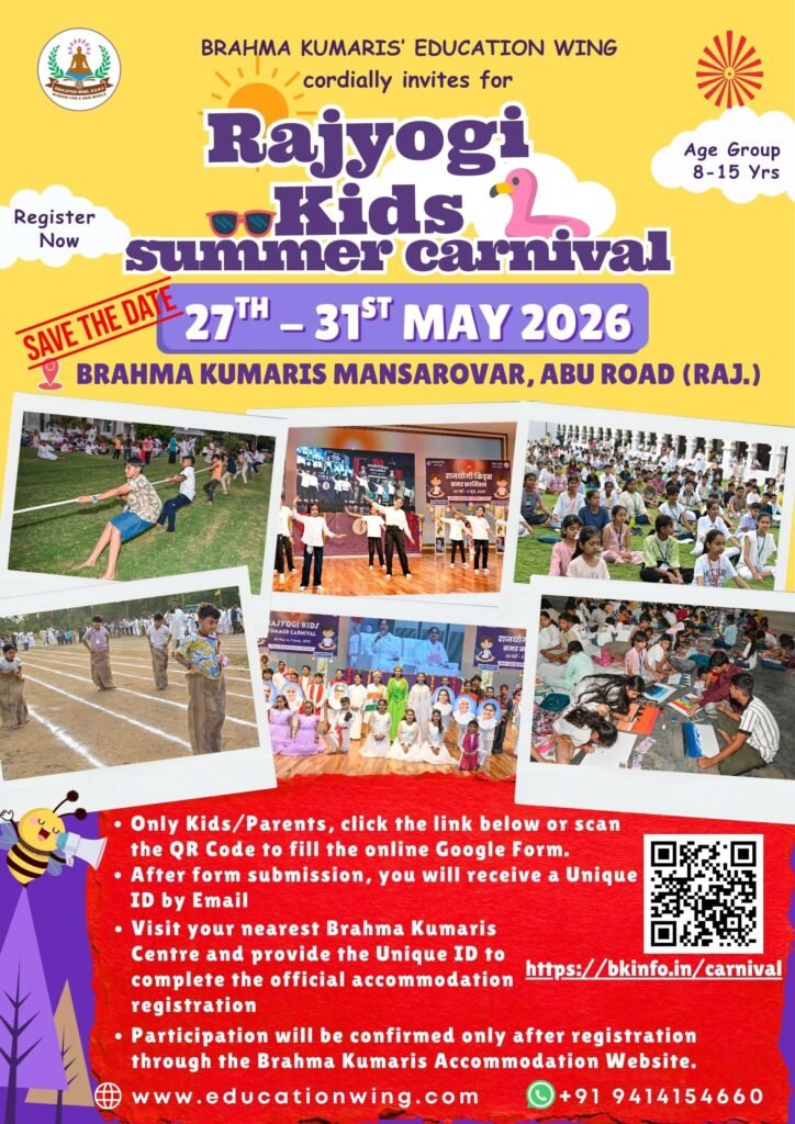 Through short meditation, positive thinking, and fun activities, children learn how to stay calm, focused, and kind in everyday life. Rajyoga helps kids discover their inner powers like peace, love, happiness, and confidence.